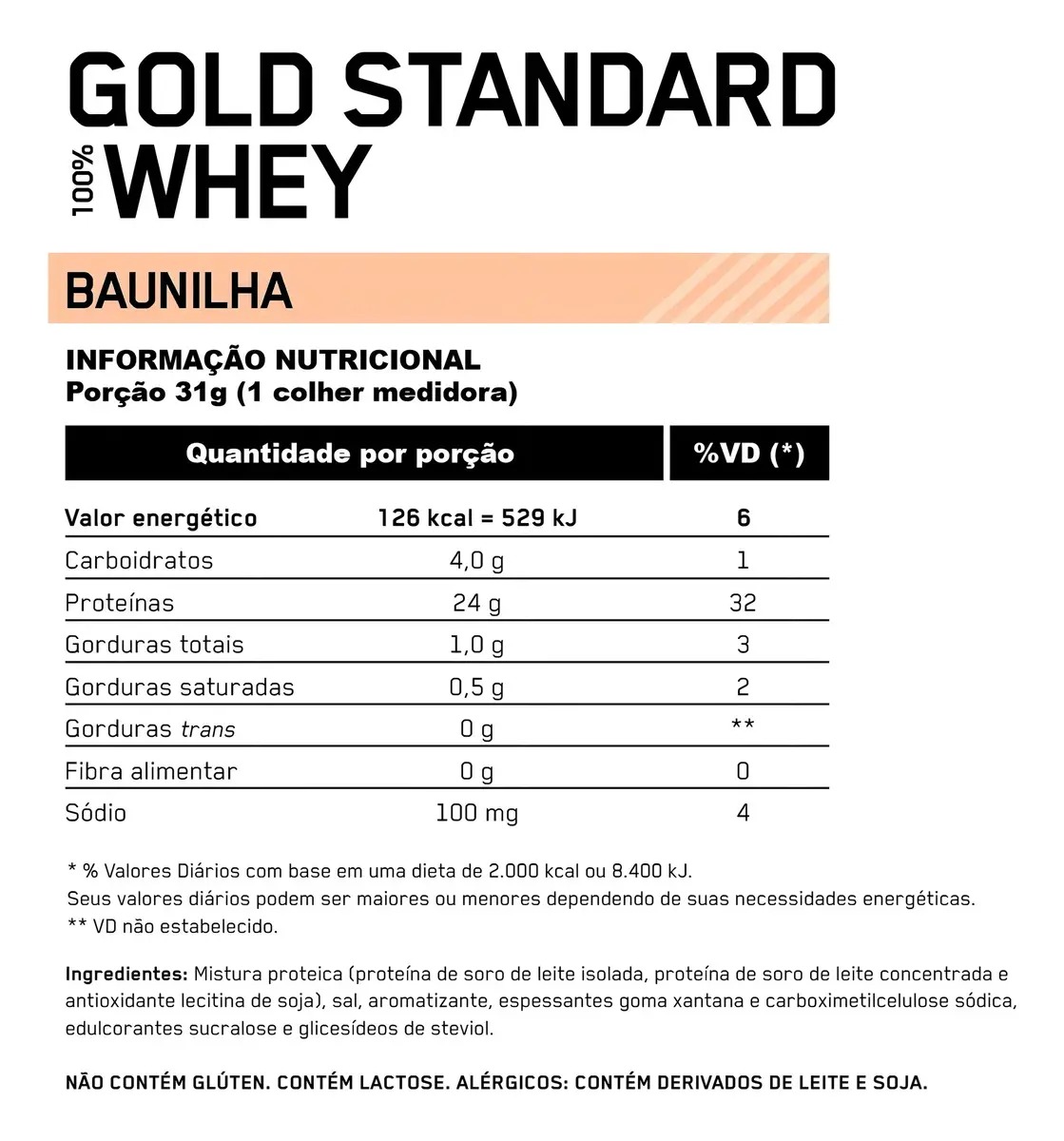 COMO TOMAR Sugere-se misturar uma porção (1 scoop) em 180ml a 200ml de água, leite ou suco natural, de acordo com sua preferência. Consuma o Whey Protein 100% Gold Standard diariamente, seja antes ou após o treino, seguindo as orientações profissionais para melhores resultados. PARA QUE SERVE O 100% Whey Gold Standard da Optimum Nutrition é um suplemento proteico recomendado para indivíduos que buscam apoiar seus regimes de exercícios, práticas esportivas ou dietas voltadas para o ganho de massa muscular magra. * Proporciona 24g de proteína por porção. * Contém lactose. * Livre de glúten.